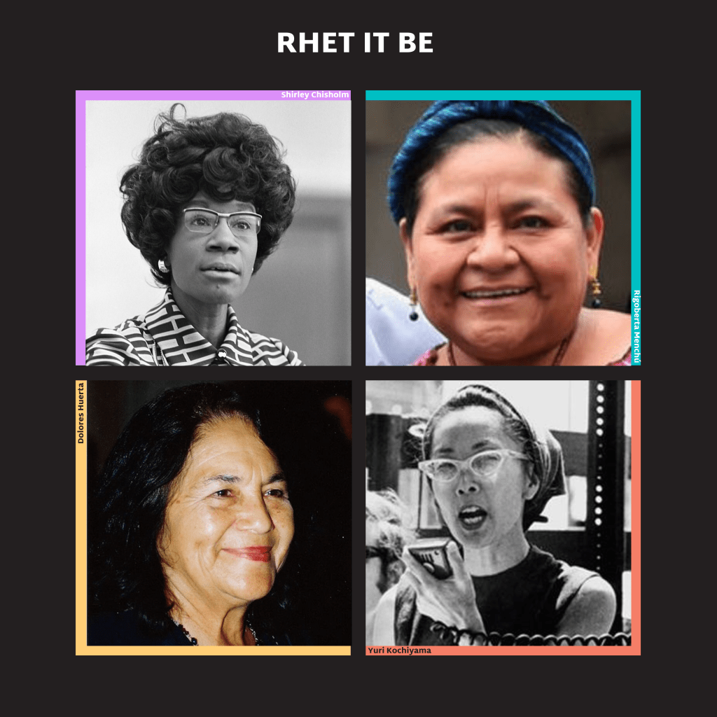 This sticker pays tribute to four of the 20th century’s most important human-rights activists, users of rhetoric par excellence—Shirley Chisholm, Rigoberta Menchú, Dolores Huerta, and Yuri Kochiyama.